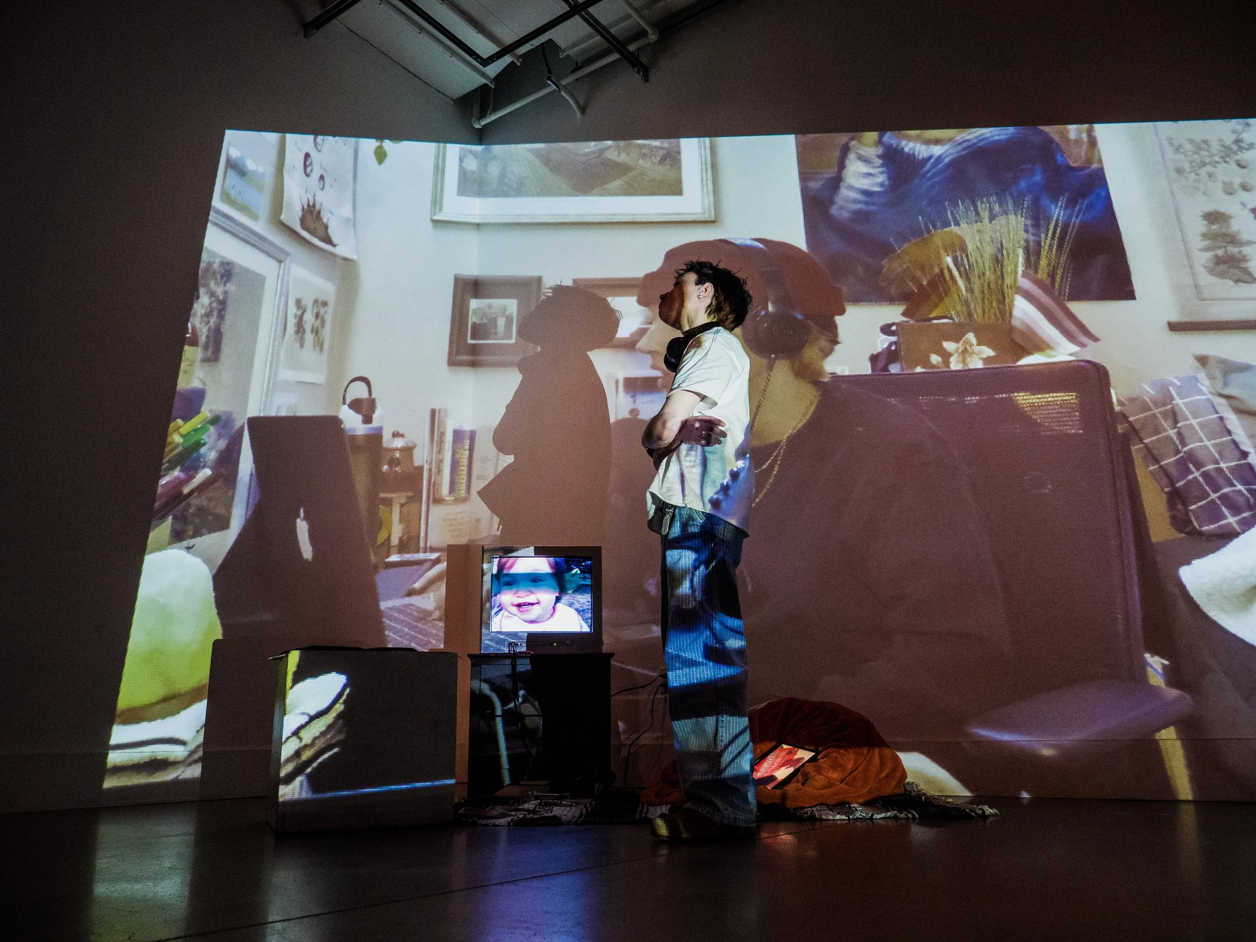 My piece “o kay red” encapsulates my growth through time through my interactions with technology. The retro television displays home videos from my infancy and stands as the centerpiece for this installation. The film captures important figures in my life interacting with me through the mediation of the camera. Little did I know I was already communicating with an object that would have such a profound impact on my life. The next projection on the tablet displayed the Youtube videos I used to create during my early childhood. The choice to display it on the vibrant bean bag came not only from the need to continue building the scene, however, growing up I had a character chair with similar form that I used to watch a lot of Youtube on. Hence the connection between the videos I was creating on the platform in combination with emulating acting the space in which I used to consume similar media. The inclusion of the physical film photos tells a unique story of cameras being passed down generationally and how that form has now become the perspective with which I see the world artisitically. All of these elements intertwined with my past, present, and future is engulfed by a large projection of my most recent project. Highlighting the person I am today as a result of the displayed collective journey and where I am headed through these interactions.
